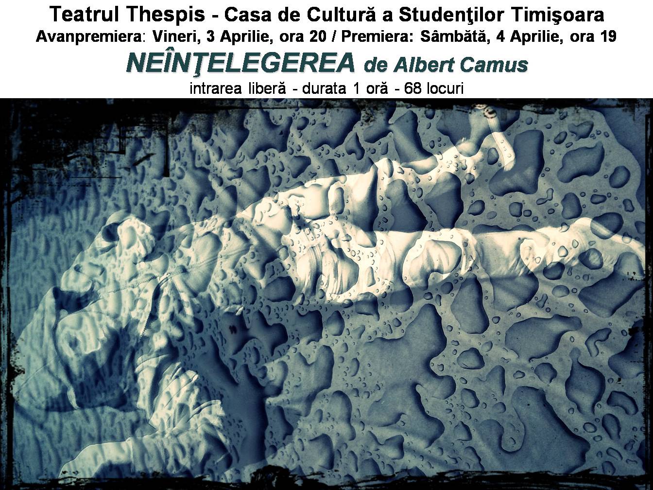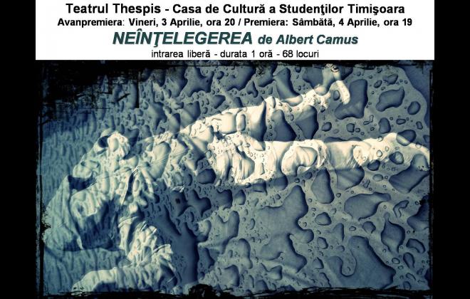 Vineri, de la ora 20, şi sâmbătă, de la ora 19, vă prezentăm premiera spectacolului “Neînţelegerea” de Albert Camus. Cu durata de o oră, în interpretarea Dianei Velescu, Ana Macrina Codrea şi Alex Bordea, spectacolul vorbeşte despre vicierea legăturilor de sânge, în goana nebună după iluzia fericirii. Pornind de la un „fapt divers” real, sub impresia directă a climatului irespirabil al anilor de ocupaţie germană din Franţa, când înflorise colaboraţionismul, delaţiunea şi crima – celebrul autor francez Albert Camus propune o neliniştitoare piesă despre rădăcinile „neînţelegerii”. O piesă despre absurdul unei lumi orbite de dorinţa de înavuţire pentru atingerea unei împliniri egoiste.