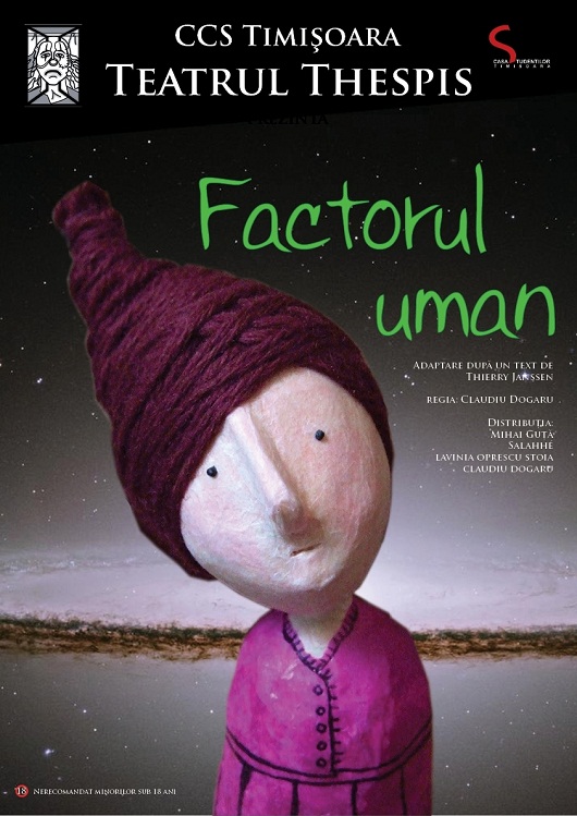 Factorul uman, prezentat in premiera pe scenele romanesti, dupa lansarea textului in cadrul Festivalului International de Teatru de la Sibiu, este o drama psihologica a unei familii fara tata, in care o mama isi manipuleaza bebe-ul de 33 de ani, Ludovic-Toto, un tanar convins ca vine de pe alta planeta. De aceea, Toto trimite rapoarte periodice catre o alta galaxie in care relateaza tot felul de intamplari ciudate de pe Pamant si isi construieste o nava spatiala in gradina, sperand ca intr-o zi sa-si regaseasca tatal. In putinul timp liber, Toto merge in locul mamei la lucru (un chiosc de ziare), unde o intalneste pe Cendre. Cendre este de fapt fantoma sorei lui, sora care fusese omorata impreuna cu tatal sau de catre mama lor. Cu accente de critica a societatii si a manipularii prin televiziune, un spectacol de actorie, fara decor, in regia actorului Claudiu Dogaru, cu Mihai Guta, Salahhé si Lavinia Oprescu-Stoia.